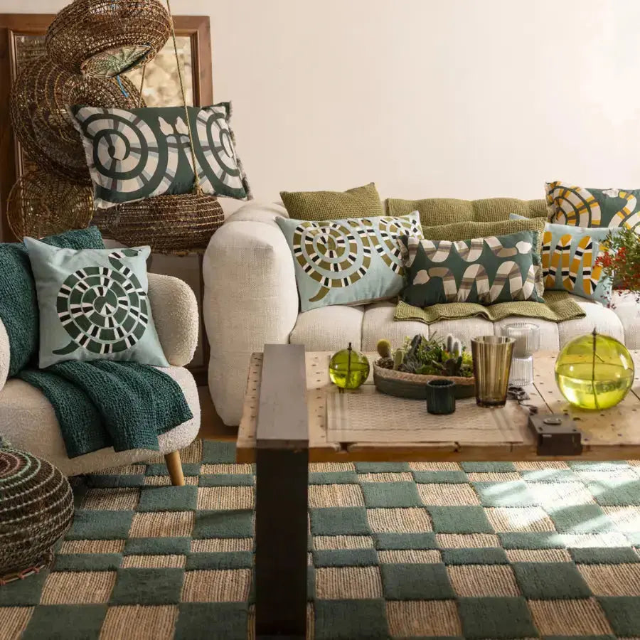 Le coussin brodé graphique en coton Yoka Ciel reprend le motif serpent emblématique de la gamme dans une version lumineuse et élégante. La broderie, dense et soignée, crée un relief subtil qui met en valeur le dessin sans rigidité.
