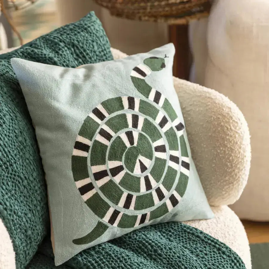 Coussin brodé graphique en coton Yoka Ciel - motif serpent - Vivaraise