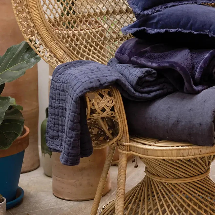 Le plaid coton Swami Marine est idéal pour apporter une touche élégante et apaisante à votre intérieur. Associez-le à des coussins en lin naturel ou en coton beige pour créer un contraste doux et lumineux, ou jouez la carte du ton sur ton en l’accordant avec des coussins bleu clair et turquoise pour une ambiance bord de mer. Dans une chambre, posé au bout du lit, il apporte profondeur et raffinement tout en restant chaleureux et cosy.