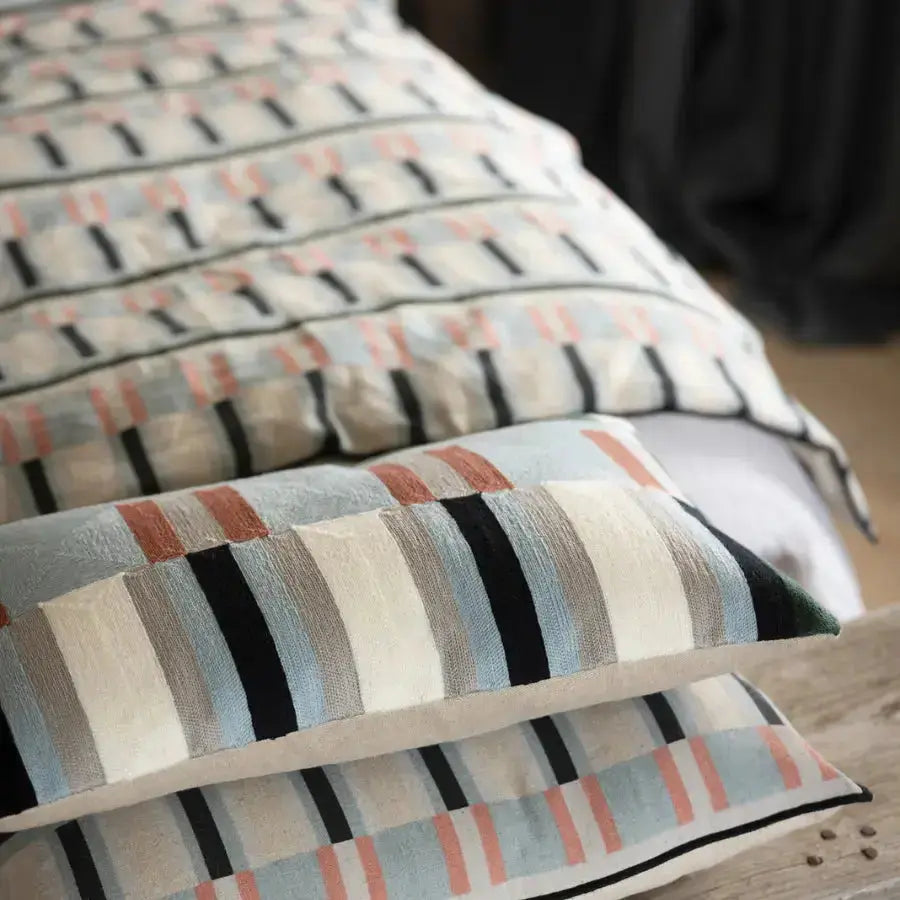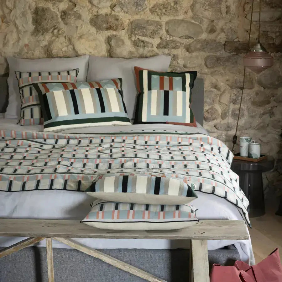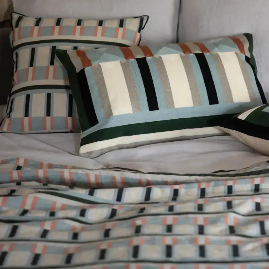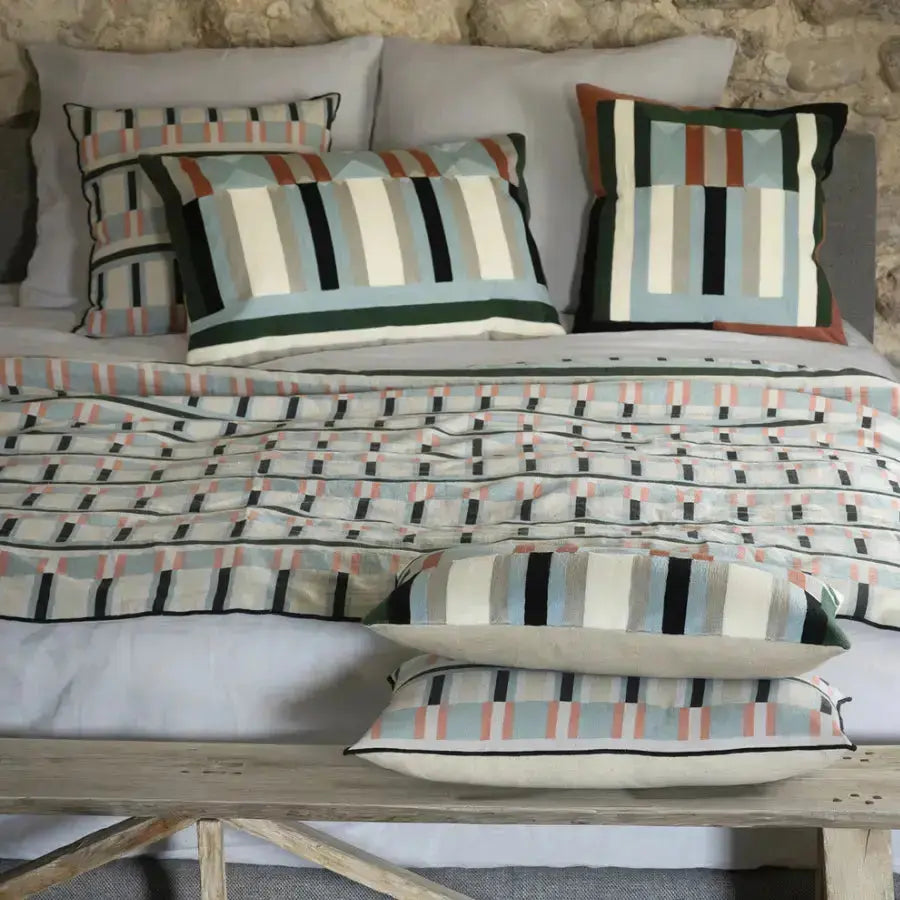 Le plaid imprimé en lin recyclé Jason Ciel s’inspire des lignes de l’architecture moderne pour créer un jeu de bandes verticales et horizontales subtil et structurant. Ses nuances de bleu ciel, de vert grisé et ses touches terracotta apportent du rythme tout en conservant une grande douceur visuelle.