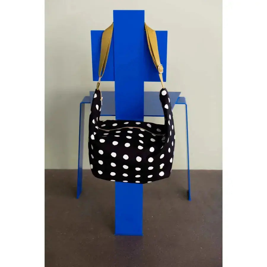 Confectionné en 100 % coton biologique, le sac demi-lune Mia Caviar séduit par son fond noir ponctué de pois blancs délicats, subtilement réveillés par une anse vert Nuts. Sa forme arrondie épouse naturellement la silhouette et se porte aussi bien à l'épaule qu'en bandoulière.